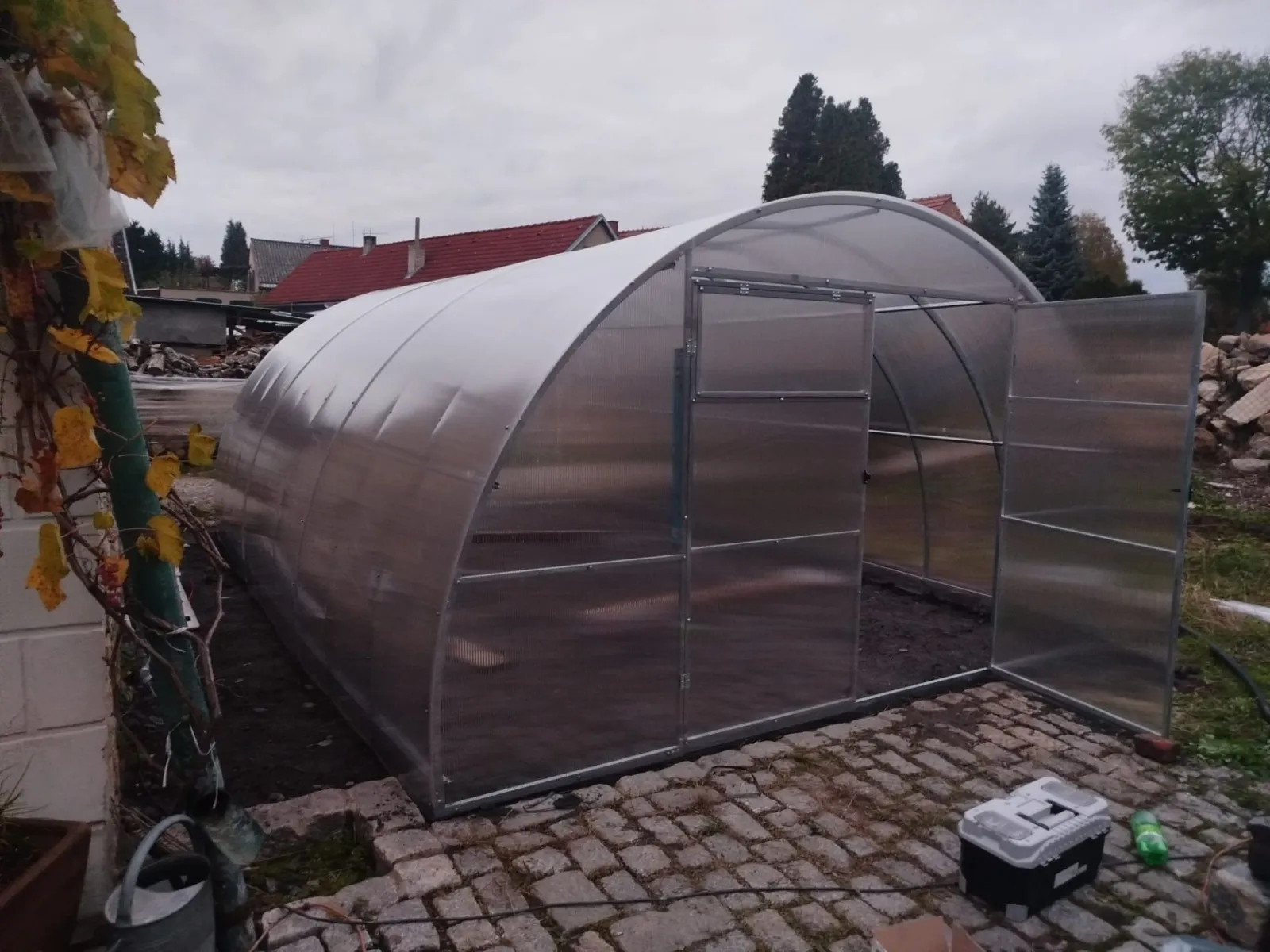 Obsahem dodávky je kompletní skleník = nosná konstrukce (včetně dveří a oken), veškeré potřebné spojovací prvky + polykarbonátové desky.
